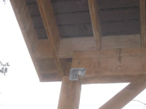 With this decking system we can look into the past a little and see that as the contractors installed the framing and sheathing everything was nice and sloped and smooth. Then the roofing was installed and part of the roofing at the lowest edge a 90° edge metal was installed. This created a little high area, right alond the edge that wouldn’t let water drain effectively but over all it was sloped and the standing water could be managed. Almost done right? Oh, wait! We still need a railing!