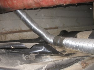 Now, right at the edge of the roof slope, where remember we had those areas of ponding, the roofing membrane was filled full of holes to mount the wooden posts. The poor home owners tried to caulk this post-to-roofing transition, but it was too late.